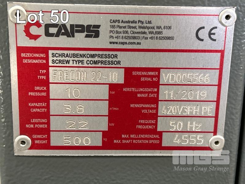 PACKAGED AIR COMPRESSOR, CAPS MOD: FRECON 22-10 DOM: 2019 MAX PRESSURE: 10 BAR CAPACITY: 3.8m3/MIN 22kw, 415V NOTE: ALL FAULTS, SOME PART DISASSEMBLED