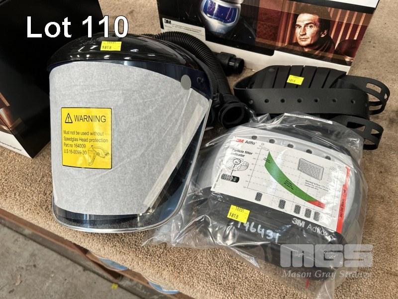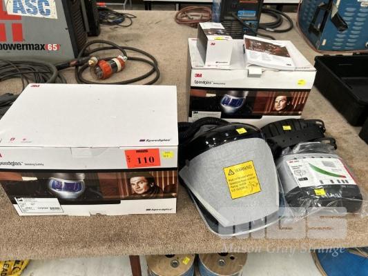 2 x PROTECTIVE HELMETS, POSITIVE AIR, 3M, SPEEDGLASS, ADFLO, CLEAR VISOR WITH FAN PACK, POWER CHARGER, HOSES, ETC (AS NEW)