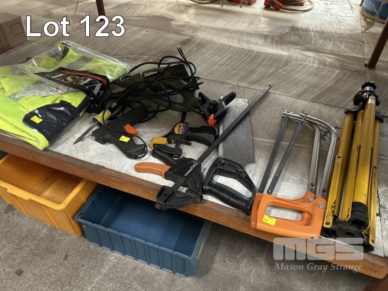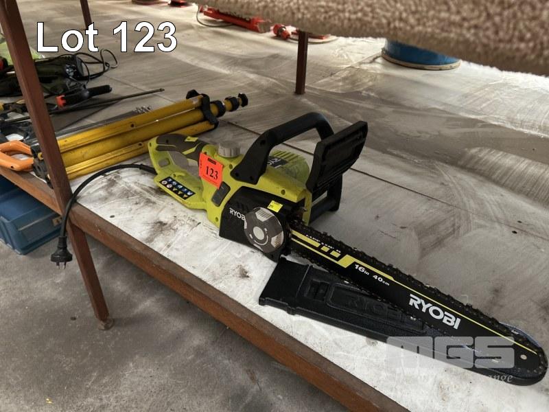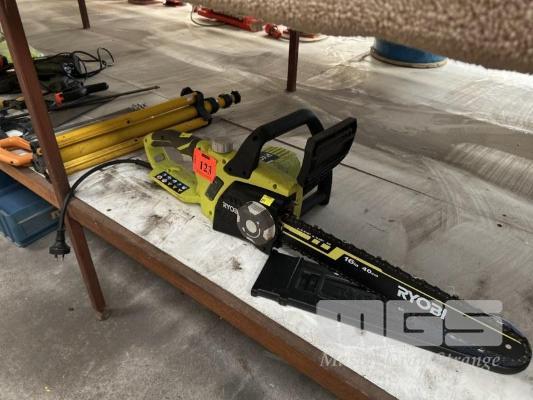CHAIN SAW, RYOBI MOD: RCS2340B 240V, 40cm BAR WITH HEAT GUN.SOLDER & GLUE GUNS, HAND SAWS, TRIPOD & HI-VIS JACKET