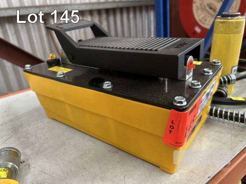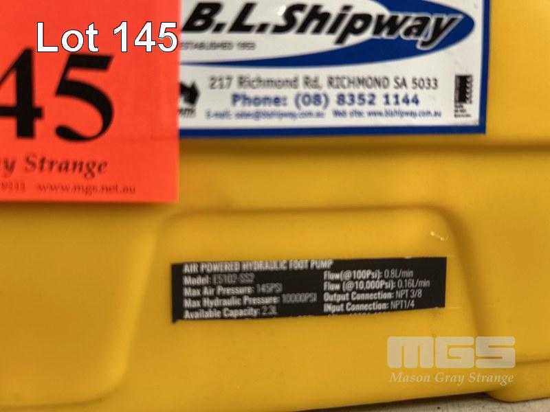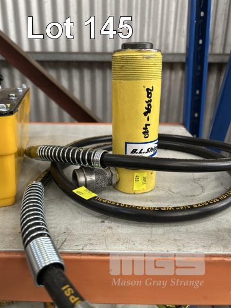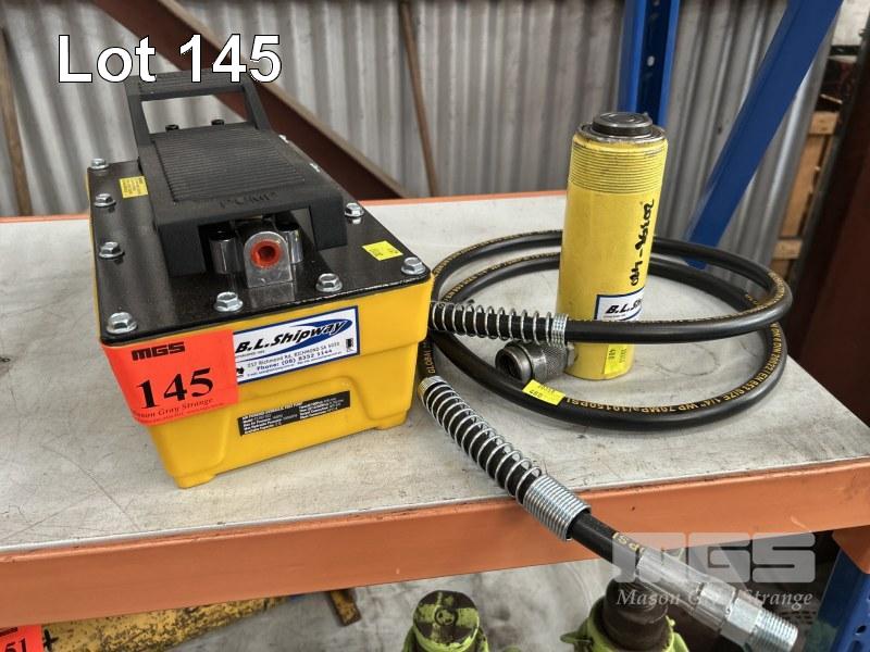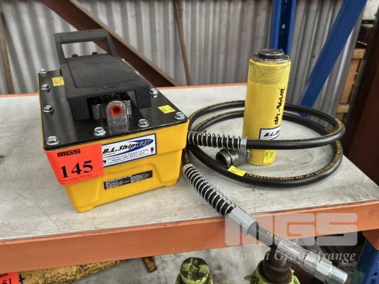 AIR POWERED HYDRAULIC PUMP, BL SHIPWAY MOD: ES102-SS2 FOOT OP, 10,000 PSI WITH HOSE FITTING S& 10 TONNE ENERPAC HYDRAULIC RAM AS NEW