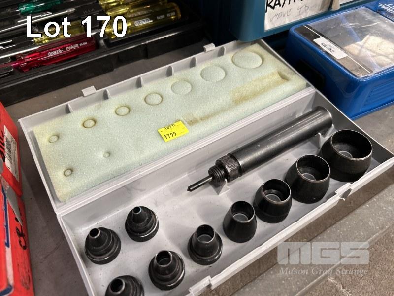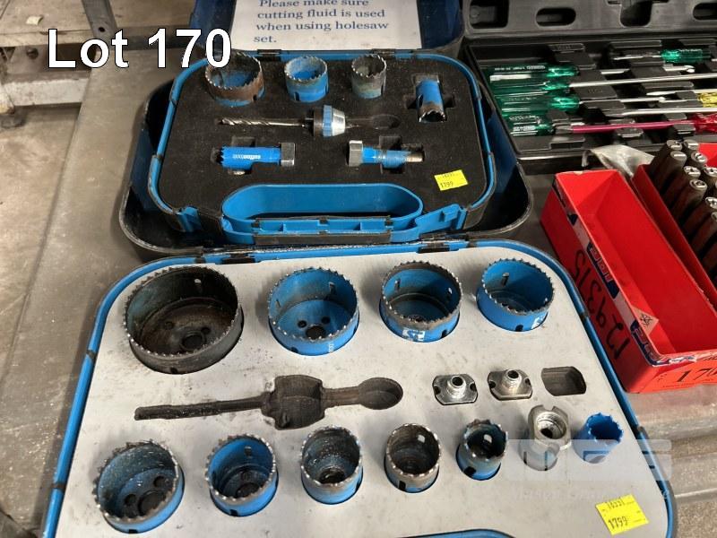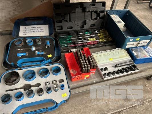 2 x HOLE SAW SETS, SUTTON NUMBER & LETTER PUNCH SET, DRILL BIT SET, 29 PIECE, ASSORTED TAPS, HOLE PUNCH & DRIVERS SETS 1 x SHELF