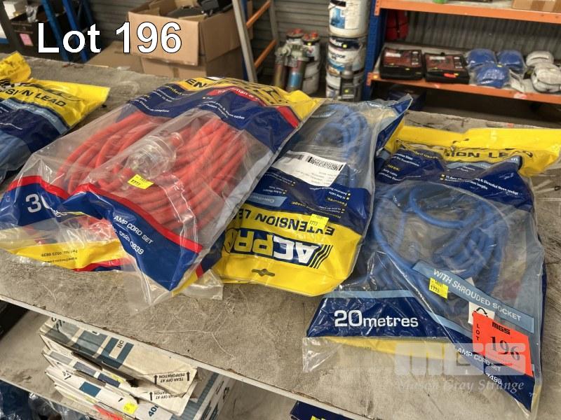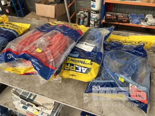 5 x ELECTRICAL EXTENSION CORDS, ACPR 240V, 15 AMP 2 @ 10m, 1 @ 20m & 10 AMP, 2 @ 30m NEW