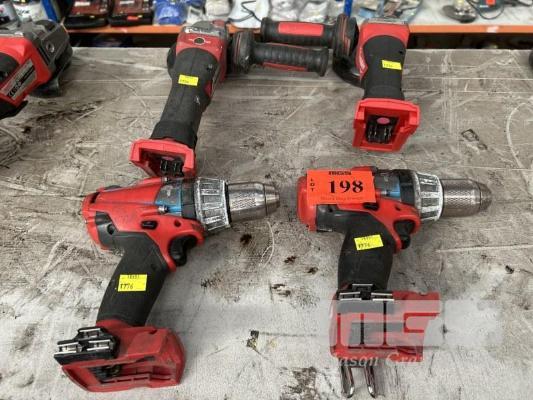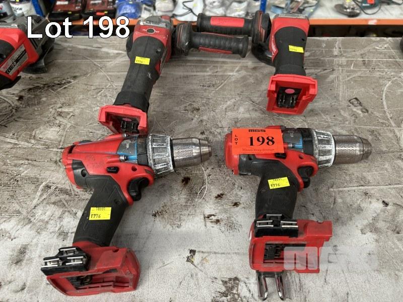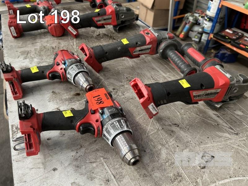 MILWAUKEE POWER TOOLS, CORDLESS INCLUDING 2 x ANGLE GRINDERS, MOD: M18CAG125XPD & 2 x DRILLS, MOD: M18CPD NO BATTERIES OR CHARGERS