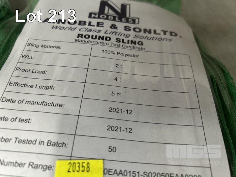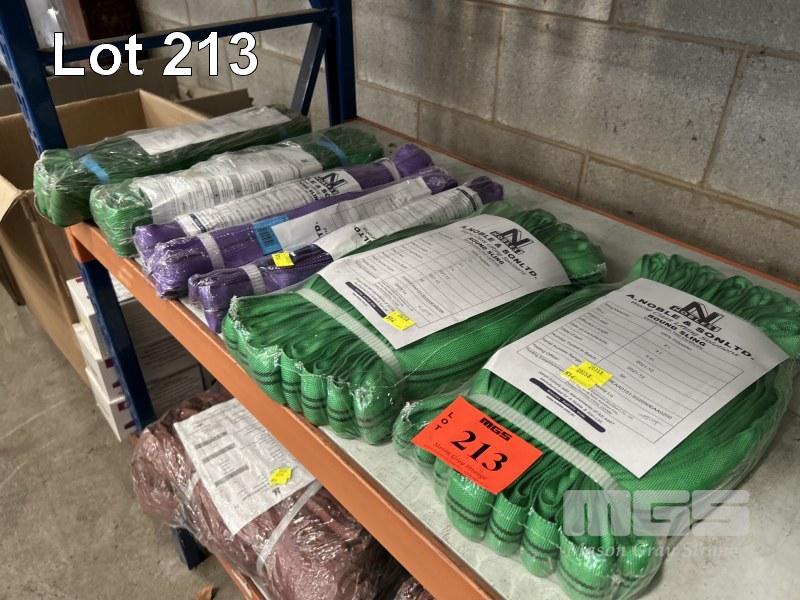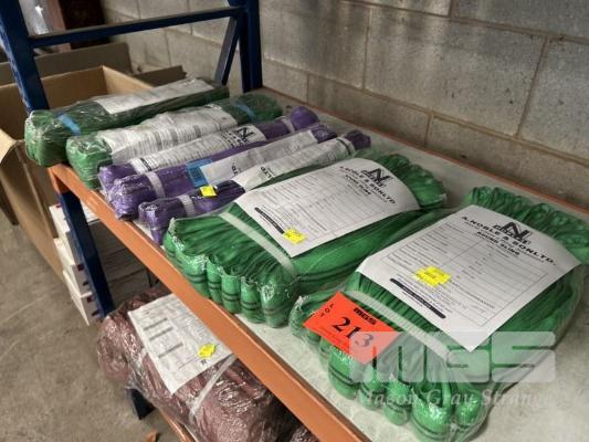 LIFTING SLINGS, NOBLE & SONS, INCLUDING 2 x GREEN, 2.5m, 2 TONNE 2 x GREEN, 5m, 2 TONNE, 3 x PURPLE, 1.5m, 1 TONNE AS NEW