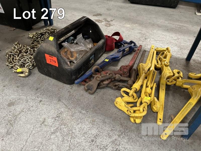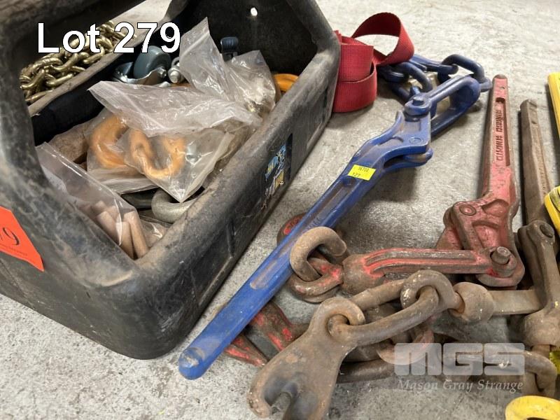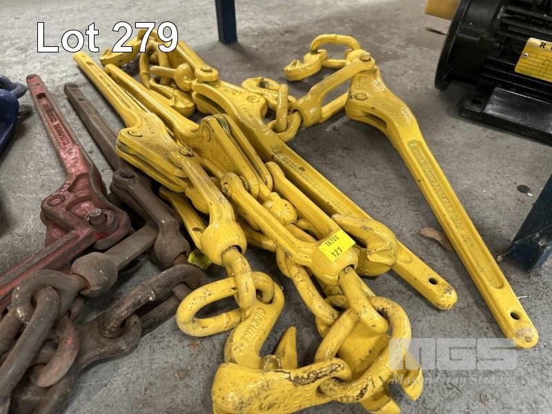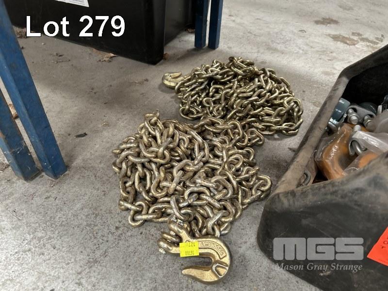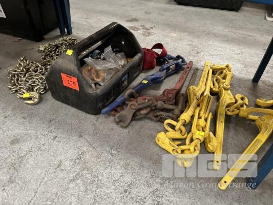 8 x CHAIN DOGS, BEAVER, 8mm, 2 x TRANSPORT CHAINS & HOOKS, 3800kg & QUANTITY HOOKS, D-SHACKLES, JOINERS, ETC