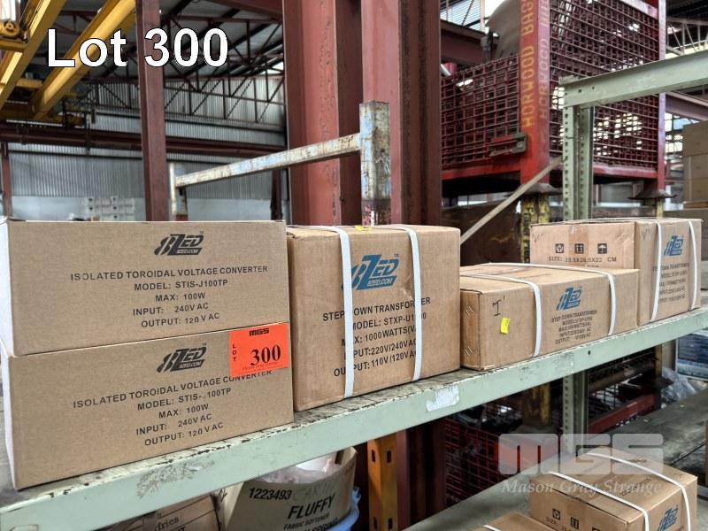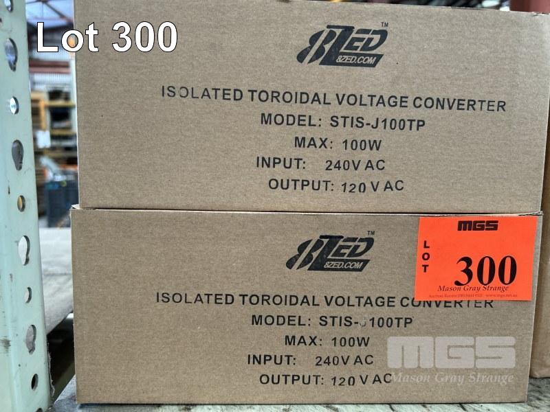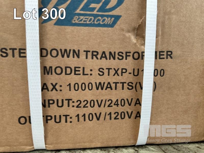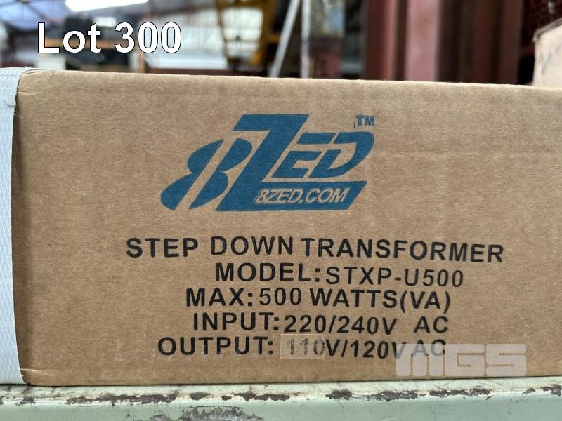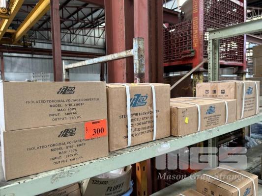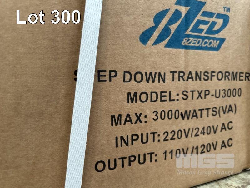STEP DOWN TRANSFORMERS & VOLTAGE CONVERTERS, 8ZED INC 1 @ 3000w, 240V TO 120V 1 @ 1000w, 240V TO 120V, 6 @ 500w, 240V TO 120V 2 @ 100w, 240V TO 120V AS NEW IN BOX 1 x SHELF