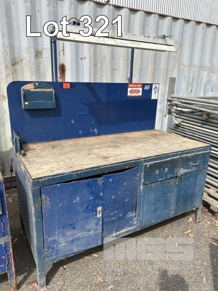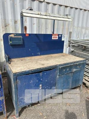 STEEL WORK BENCH WITH BACK STOP, 2 DOOR & 2 DRAWER UNDERBENCH STORAGE, SIZE: 1830 x 870 x 930mm(H) FITTED WITH OVERHEAD WORK LIGHT