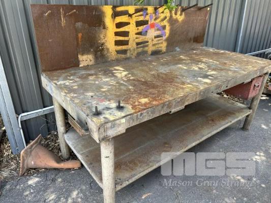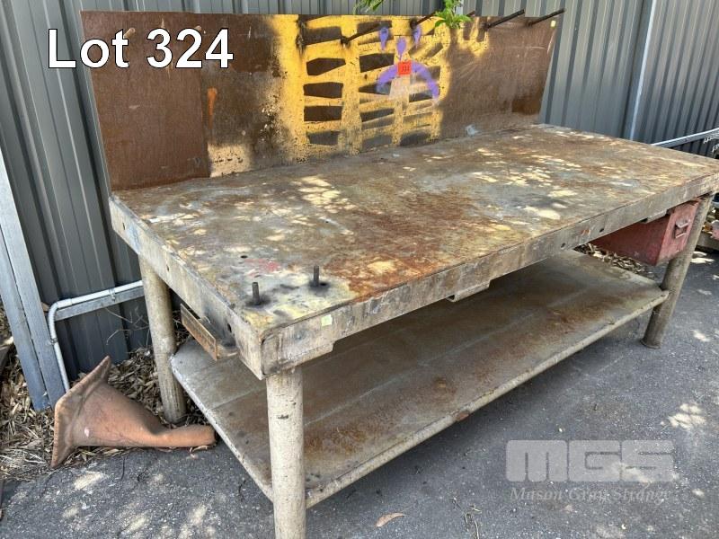 HEAVY DUTY STEEL WORK BENCH, 2130 x 930 x 860mm (H), 2 TIER, PLATE TOP WITH BACK STOP
