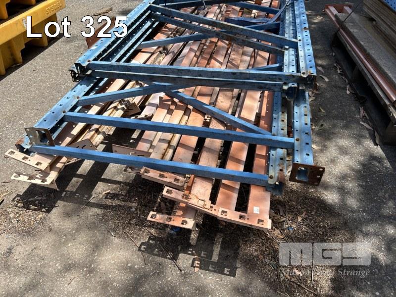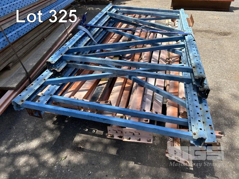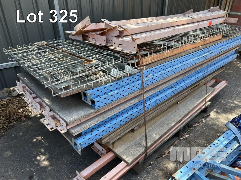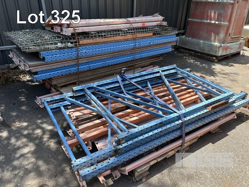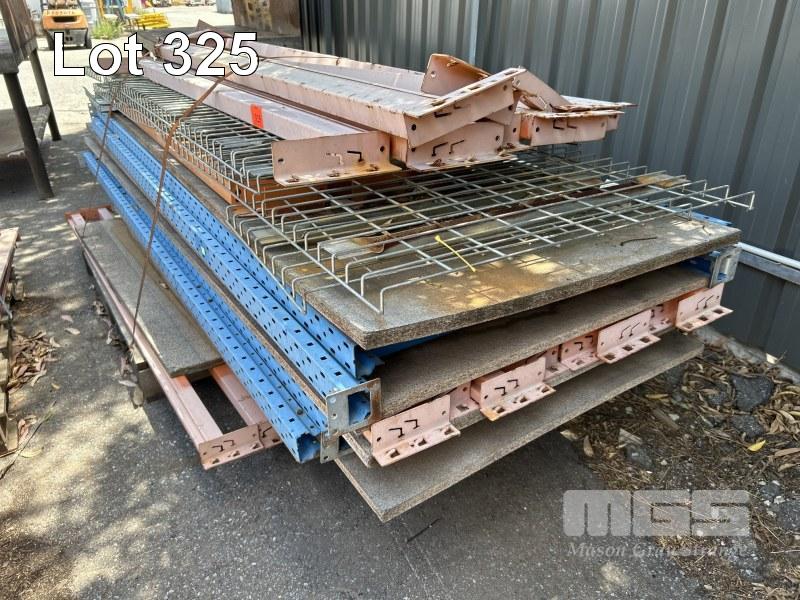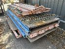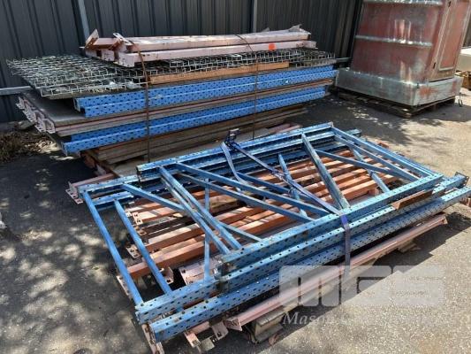 PALLET RACKING COMPRISING 4 x UPRIGHTS @ 2400mm & 2 @ 2200mm QUANTITY CROSS BEAMS & TIMBER SHELVING 2 x PALLETS
