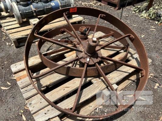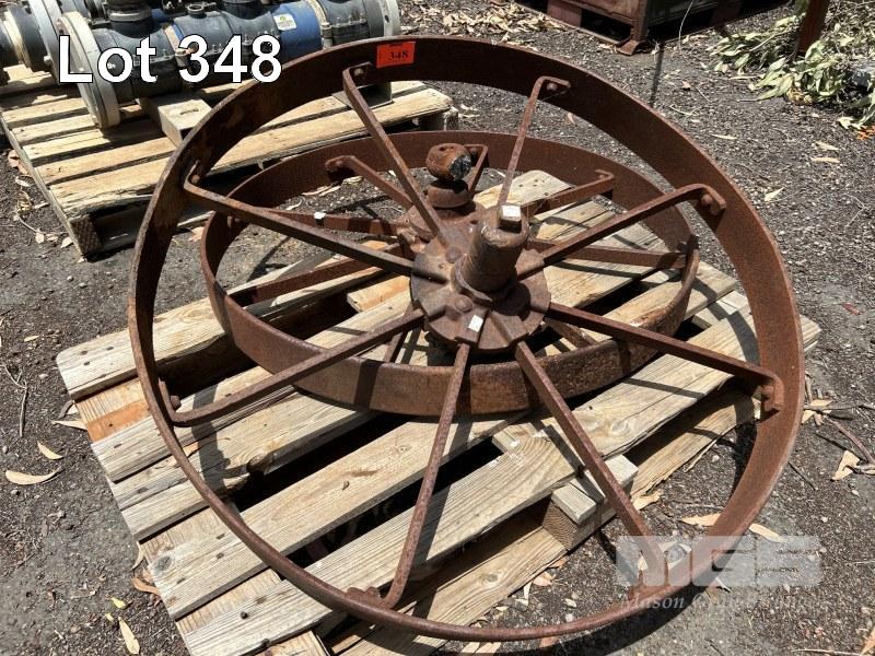 PAIR VINTAGE SPOKED STEEL WAGON WHEELS, MATCHING, 1000mm DIAMETER