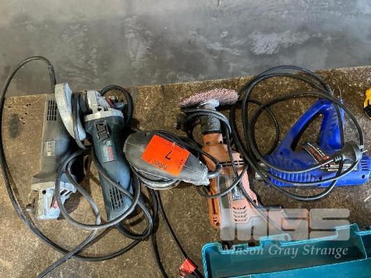 HEAT GUN, 2 x BOSCH GRINDERS, DRILL, SANDER, ETC