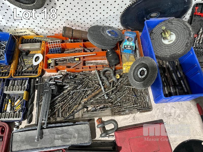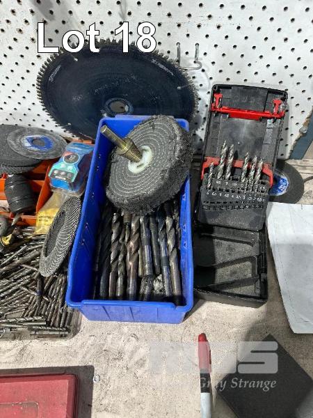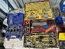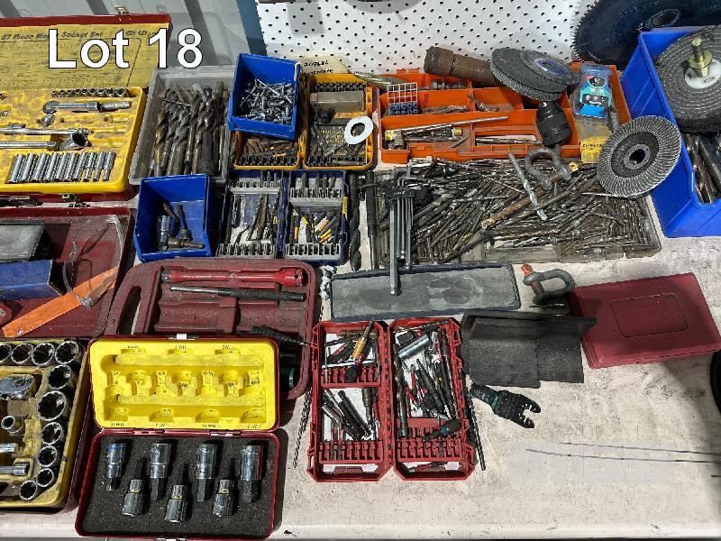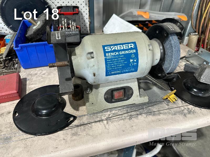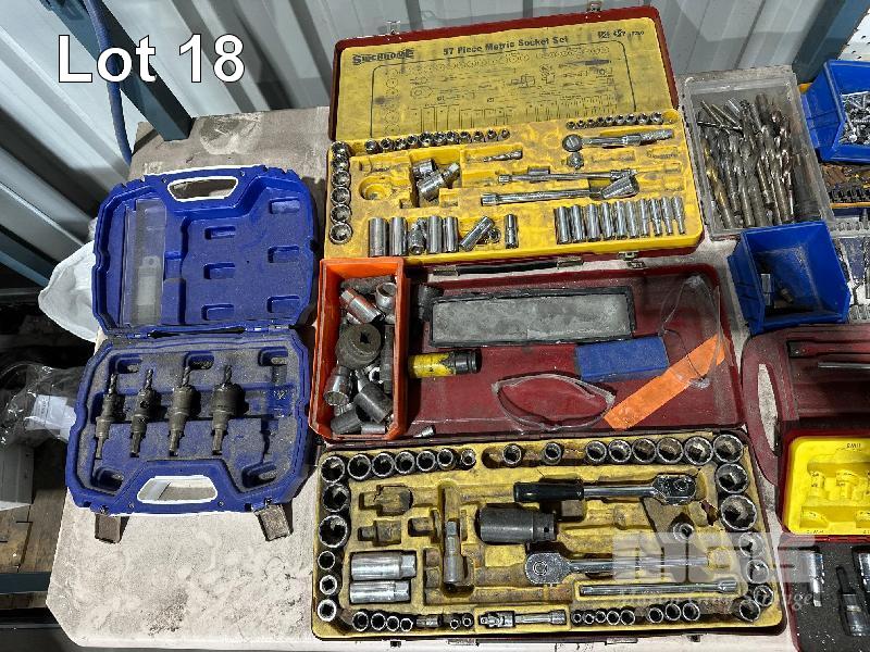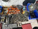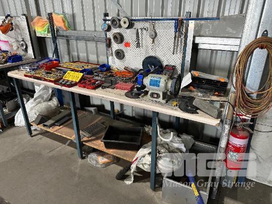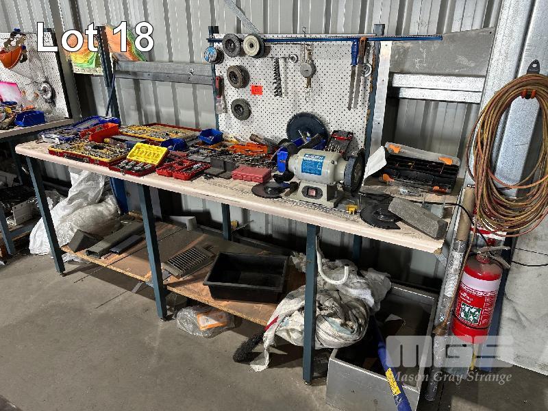 TUBE STEEL BENCH, 2400 x 750mm & CONTENTS INCLUDING PART SIDCHROME SOCKET SET, ALLEN KEYS, HOLE SAWS, SABER BENCH GRINDER, 6", DRILL BITS, ETC