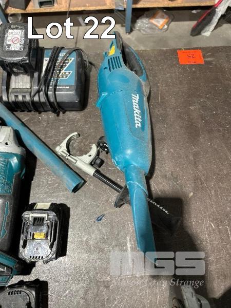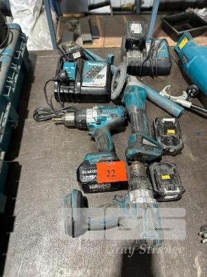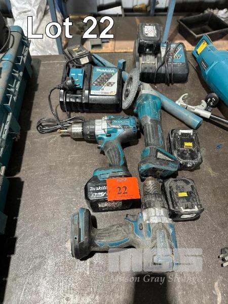 2 x MAKITA CORDLESS DRILLS, 18V, 5" GRINDER, VACUUM, 4 x BATTERIES & 2 x CHARGERS