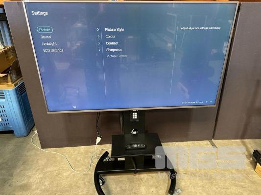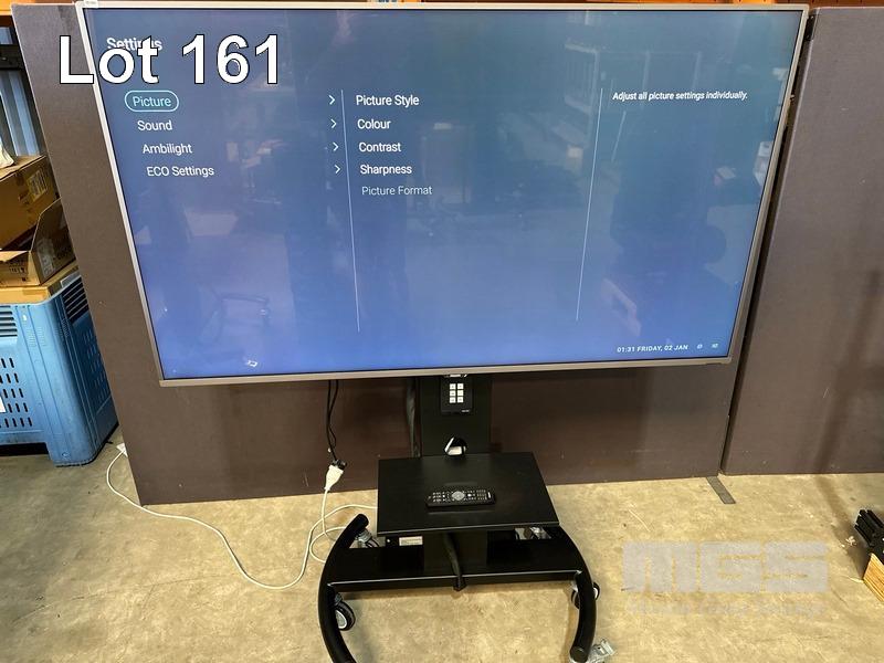 PHILIPS 65" COMMERCIAL 4K ULTRA HD LED DISPLAY, 65HFL7011T/12 & REMOTE WITH AMX PANEL, POWER BOARD & 5-PORT NETWORK SWITCH ON AMM MOBILE STAND S/N:FZ1A1727017837