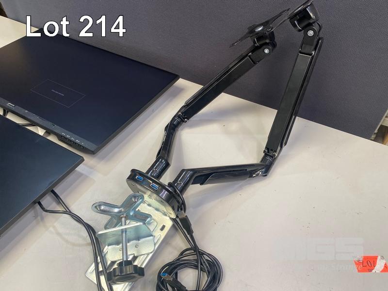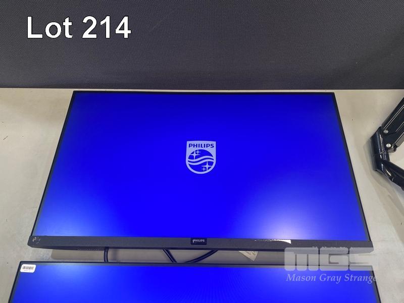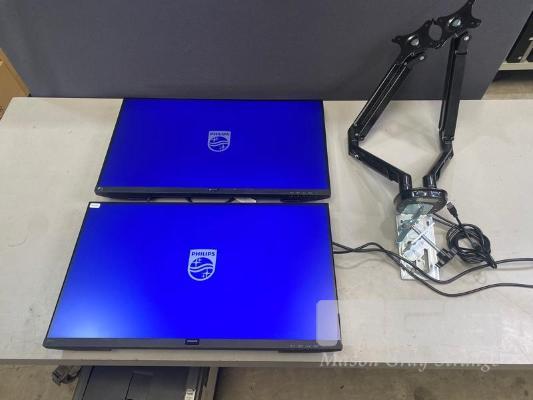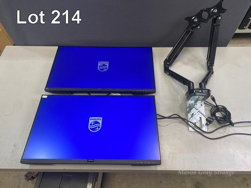 2 x MONITORS, PHILIPS 271V8/75 27" IPS WIDESCREEN, HDMI, VGA (WITH CABLES) WITH DUAL DESK MOUNT STAND S/N:UK02043013252, UK02043024365