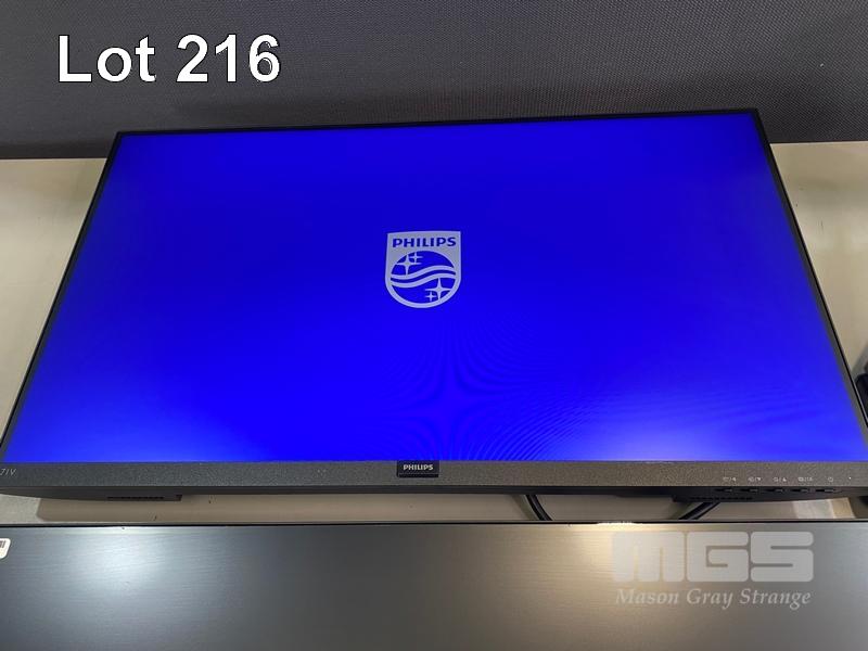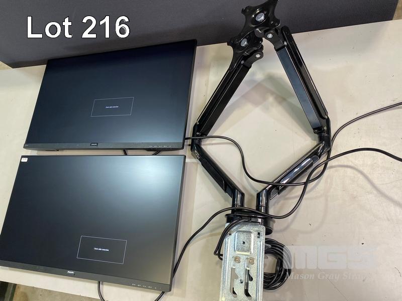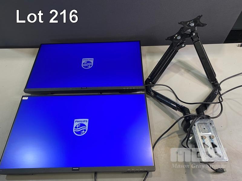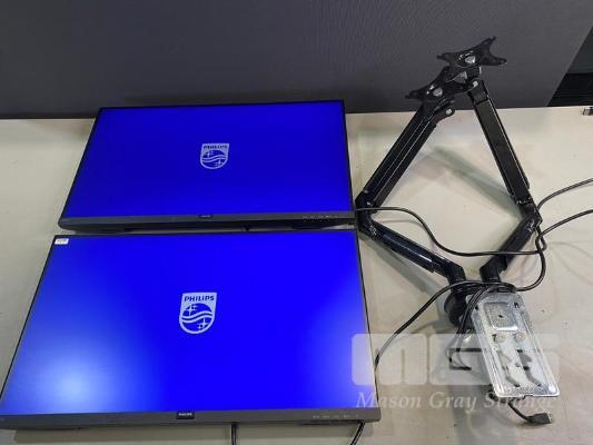 2 x MONITORS, PHILIPS 271V8/75 27" IPS WIDESCREEN, HDMI, VGA (WITH CABLES) WITH DUAL DESK MOUNT STAND S/N:UK02043013414, UK02051038686