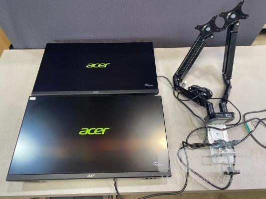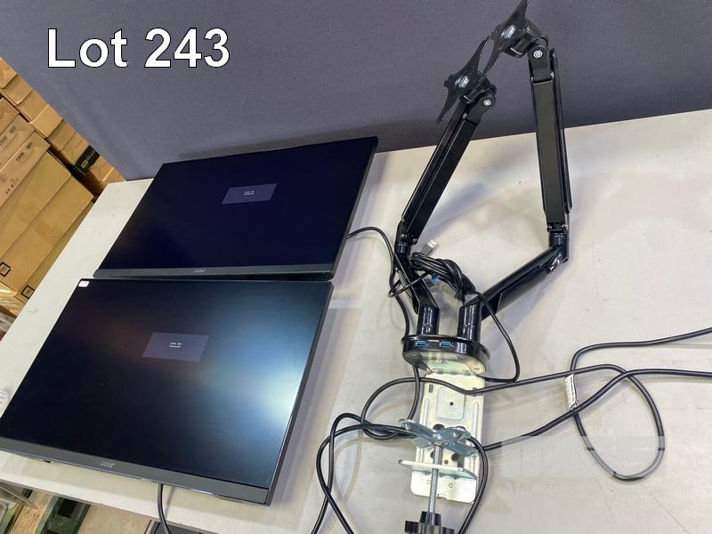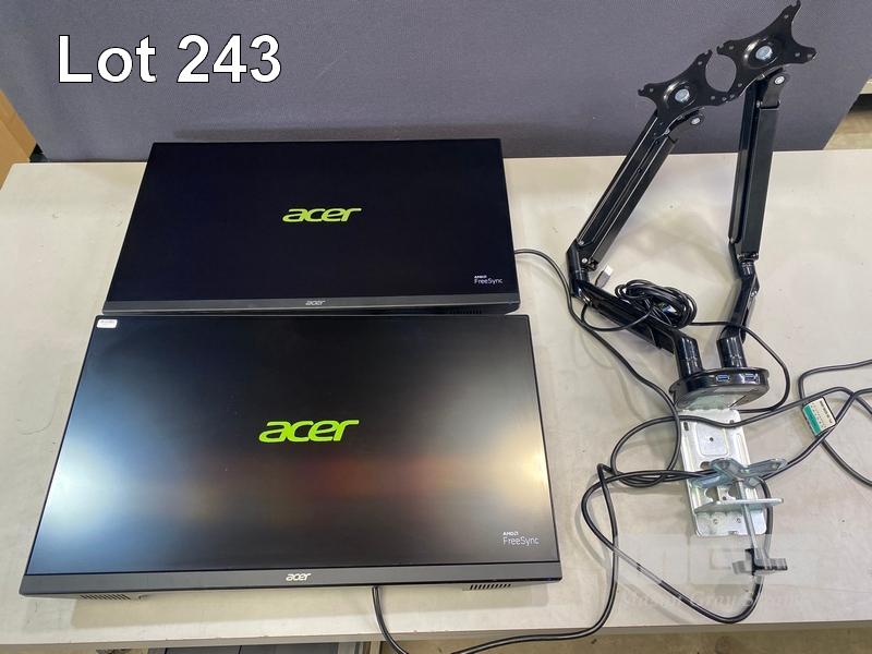 2 x MONITORS, ACER KA272 27" IPS WIDESCREEN, HDMI, VGA (WITH CABLES) WITH DUAL DESK MOUNT STAND S/N:042042182332, 042040937332