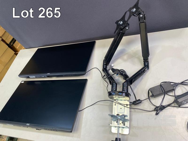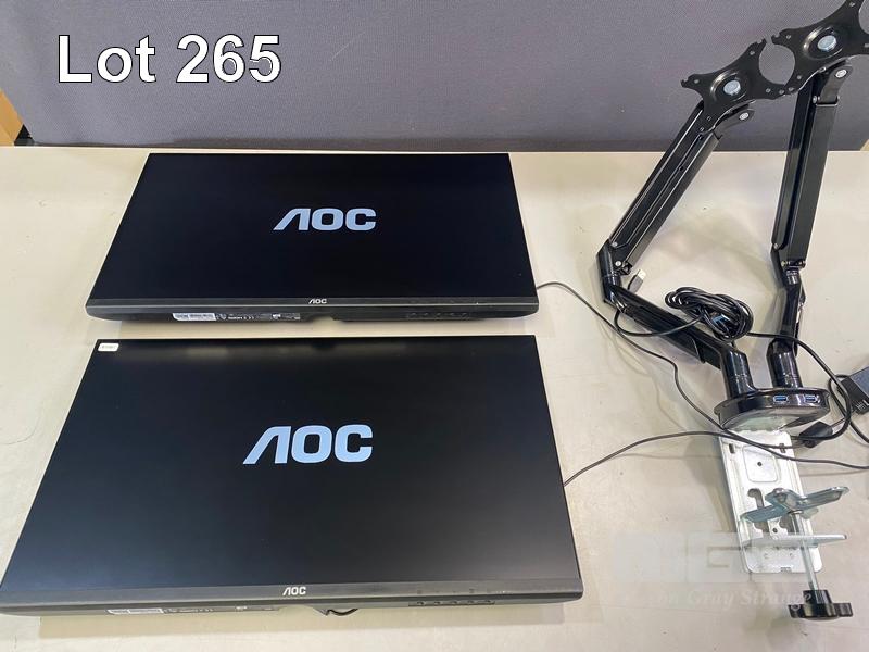2 x MONITORS, AOC 27B2H/75 27" IPS WIDESCREEN, HDMI, VGA (WITH CABLES) WITH DUAL DESK MOUNT STAND S/N:QADM7HA249099, QADM7HA249096