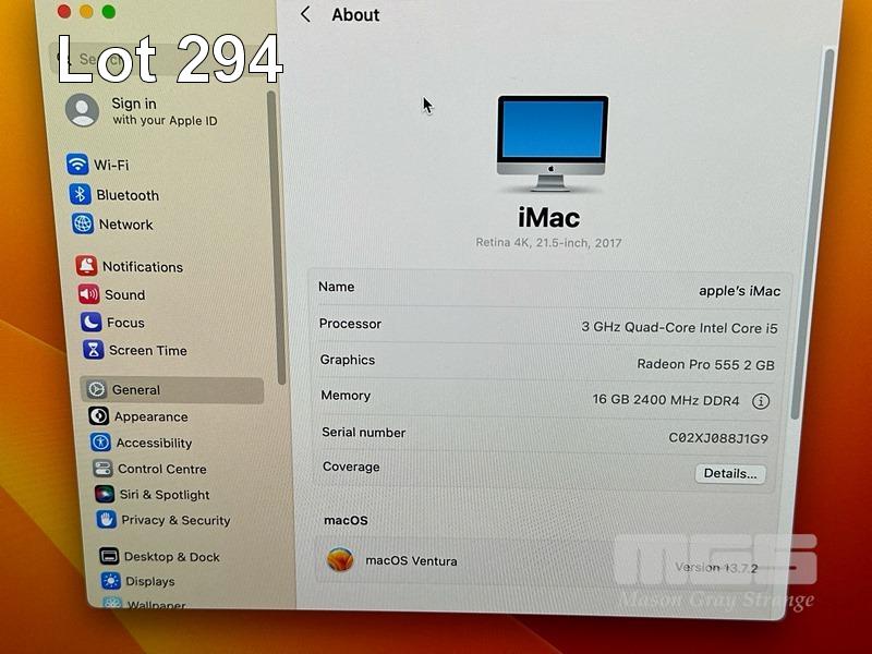 APPLE iMAC (A1418), CORE i5 7400 (7TH GEN) @ 3GHz, 16GB DDR4 RAM, 1TB FUSION DRIVE, BUILT-IN 21.5" RETINA DISPLAY (4096x2304), 2GB RADEON PRO 555 VIDEO, Wi-Fi, BLUETOOTH, MAC OS 13 INSTALLED, MACALLY KEYBOARD & MOUSE S/N:C02XJ088J1G9