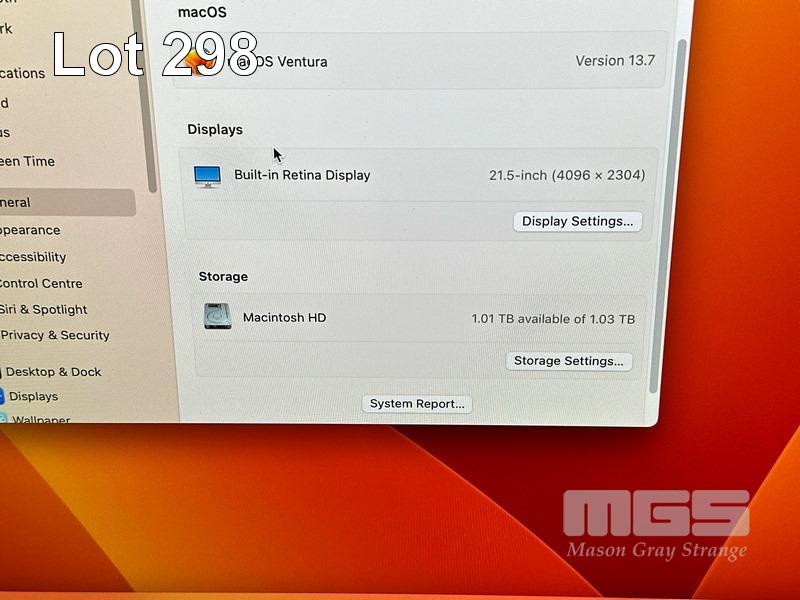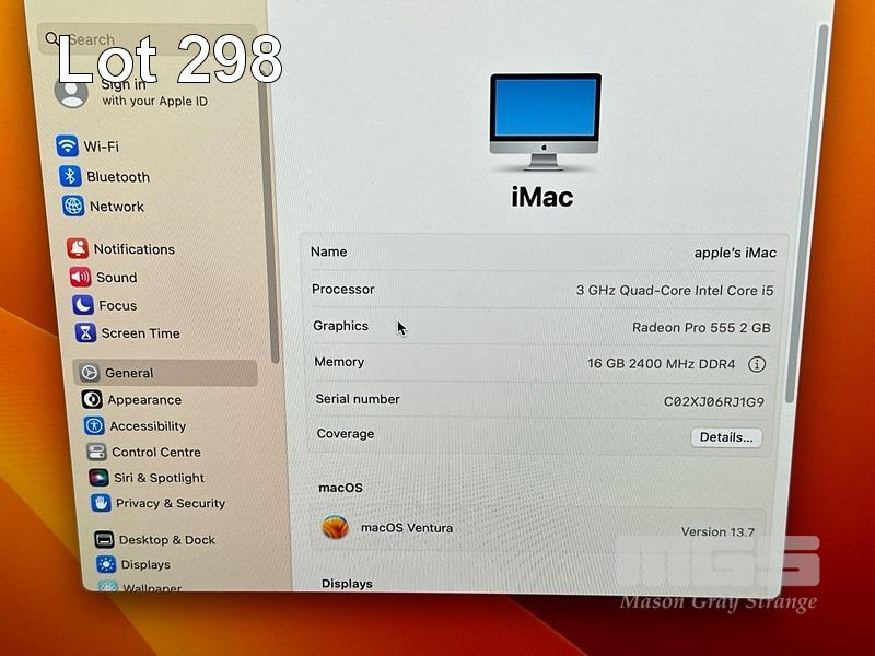 APPLE iMAC (A1418), CORE i5 7400 (7TH GEN) @ 3GHz, 16GB DDR4 RAM, 1TB FUSION DRIVE, BUILT-IN 21.5" RETINA DISPLAY (4096x2304), 2GB RADEON PRO 555 VIDEO, Wi-Fi, BLUETOOTH, MAC OS 13 INSTALLED, MACALLY KEYBOARD & MOUSE S/N:C02XJ06RJ1G9