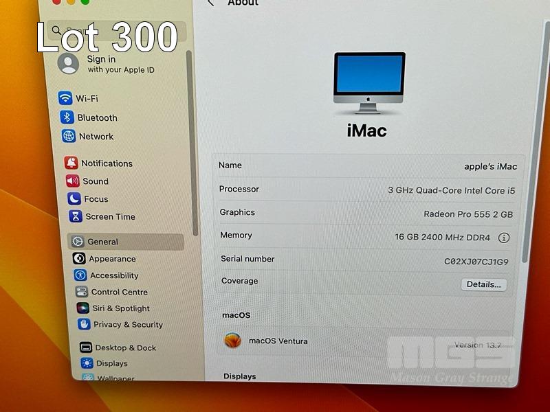 APPLE iMAC (A1418), CORE i5 7400 (7TH GEN) @ 3GHz, 16GB DDR4 RAM, 1TB FUSION DRIVE, BUILT-IN 21.5" RETINA DISPLAY (4096x2304), 2GB RADEON PRO 555 VIDEO, Wi-Fi, BLUETOOTH, MAC OS 13 INSTALLED, MACALLY KEYBOARD & MOUSE S/N:C02XJ07CJ1G9