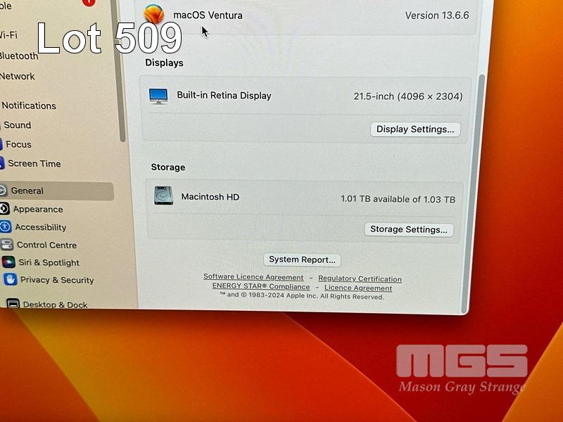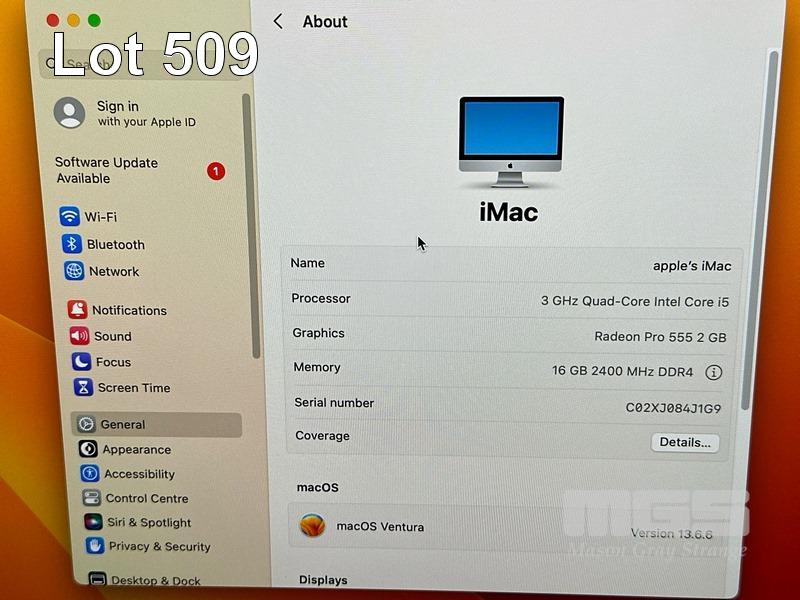APPLE iMAC (A1418), CORE i5 7400 (7TH GEN) @ 3GHz, 16GB DDR4 RAM, 1TB FUSION DRIVE, BUILT-IN 21.5" RETINA DISPLAY (4096x2304), 2GB RADEON PRO 555 VIDEO, Wi-Fi, BLUETOOTH, MAC OS 13 INSTALLED, MACALLY KEYBOARD & MOUSE S/N:C02XJ084J1G9