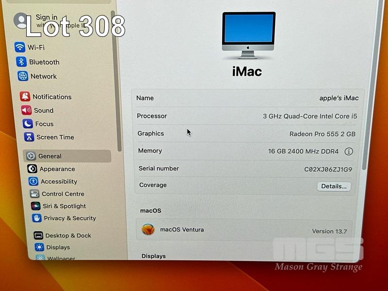 APPLE iMAC (A1418), CORE i5 7400 (7TH GEN) @ 3GHz, 16GB DDR4 RAM, 1TB FUSION DRIVE, BUILT-IN 21.5" RETINA DISPLAY (4096x2304), 2GB RADEON PRO 555 VIDEO, Wi-Fi, BLUETOOTH, MAC OS 13 INSTALLED, MACALLY KEYBOARD & MOUSE S/N:C02XJ06ZJ1G9