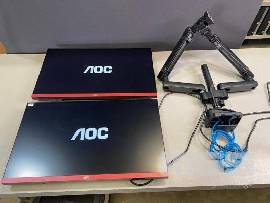 2 x MONITORS, AOC G2790VX 27" GAMING WIDESCREEN, HDMI, DISPLAYPORT (WITH CABLES) WITH DUAL DESK MOUNT STAND S/N:SOZN2HA001361, SOZN2HA000132