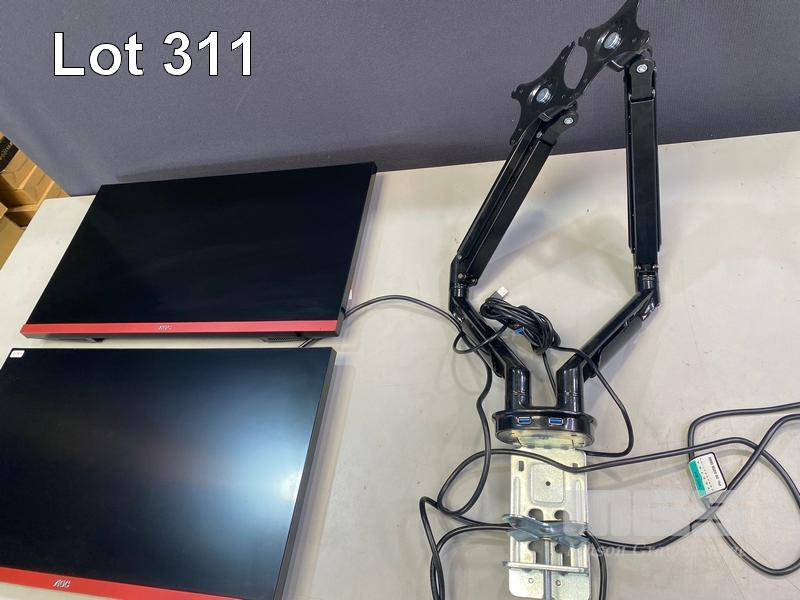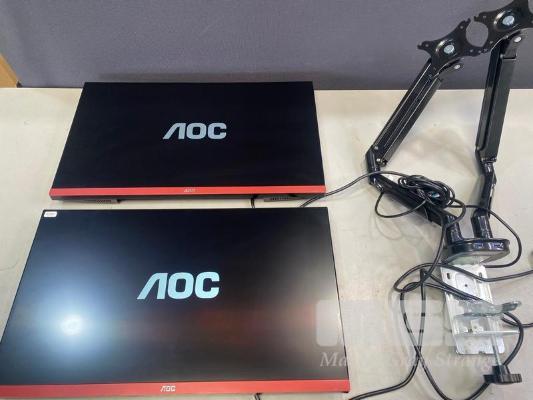 2 x MONITORS, AOC G2790VX 27" GAMING WIDESCREEN, HDMI, DISPLAYPORT (WITH CABLES) WITH DUAL DESK MOUNT STAND S/N:PNGM6HA017998, PNGM6HA017913