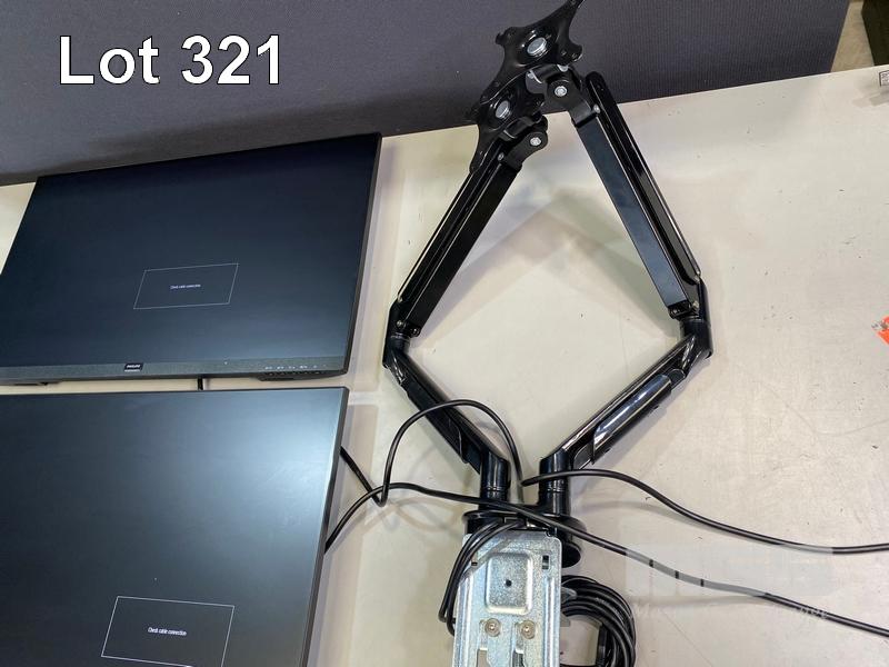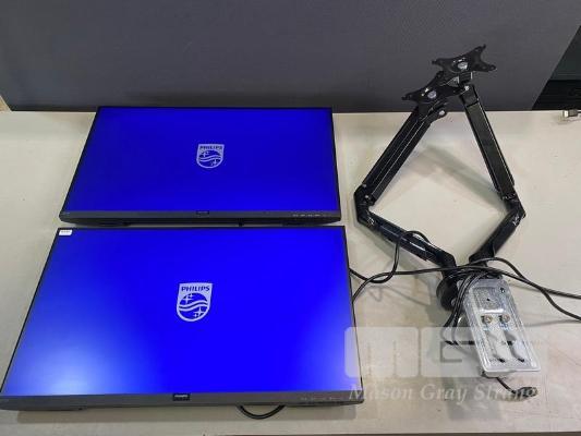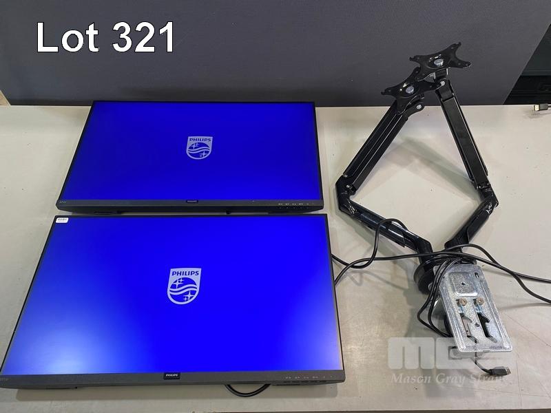 2 x MONITORS, PHILIPS 271V8/75 27" IPS WIDESCREEN, HDMI, VGA (WITH CABLES) WITH DUAL DESK MOUNT STAND S/N:UK02043024712, UK02043024720