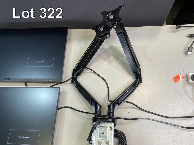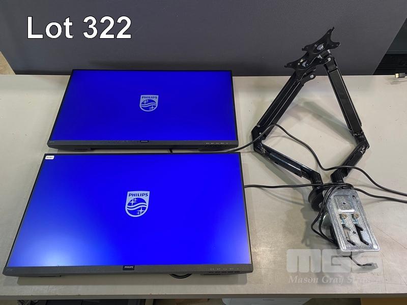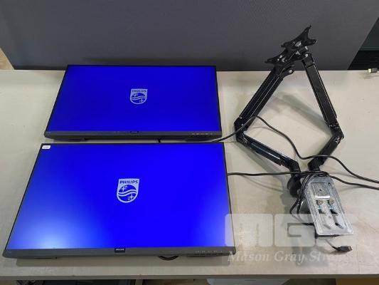 2 x MONITORS, PHILIPS 271V8/75 27" IPS WIDESCREEN, HDMI, VGA (WITH CABLES) WITH DUAL DESK MOUNT STAND S/N:UK02043024519, UK02042014719