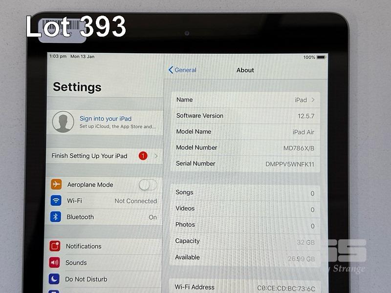 APPLE iPAD AIR, 32GB, Wi-Fi, SPACE GREY, MODEL MD786X/B, A1474 WITH CABLE & CHARGER S/N:DMPPV5WNFK11
