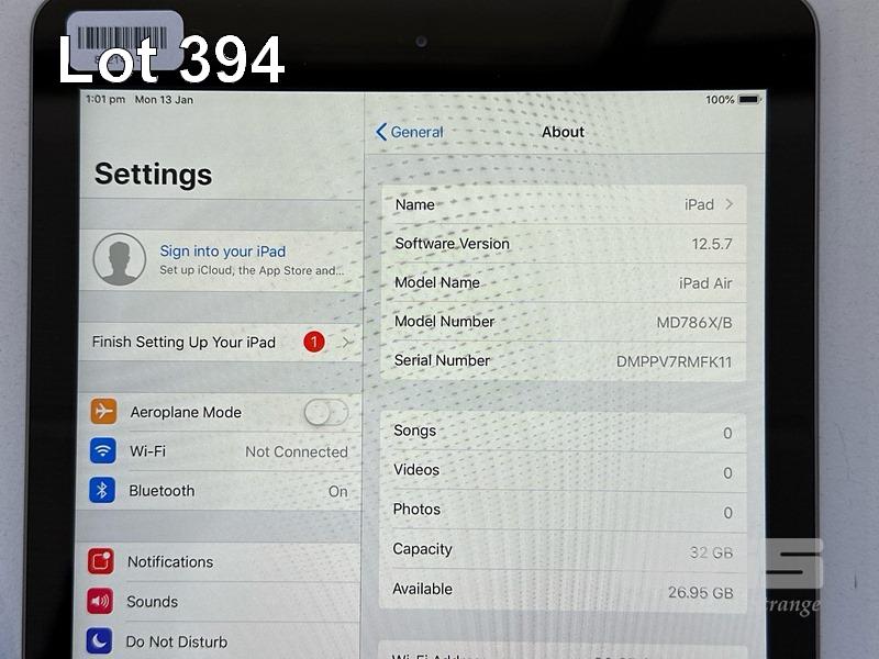 APPLE iPAD AIR, 32GB, Wi-Fi, SPACE GREY, MODEL MD786X/B, A1474 WITH CABLE & CHARGER S/N:DMPPV7RMFK11