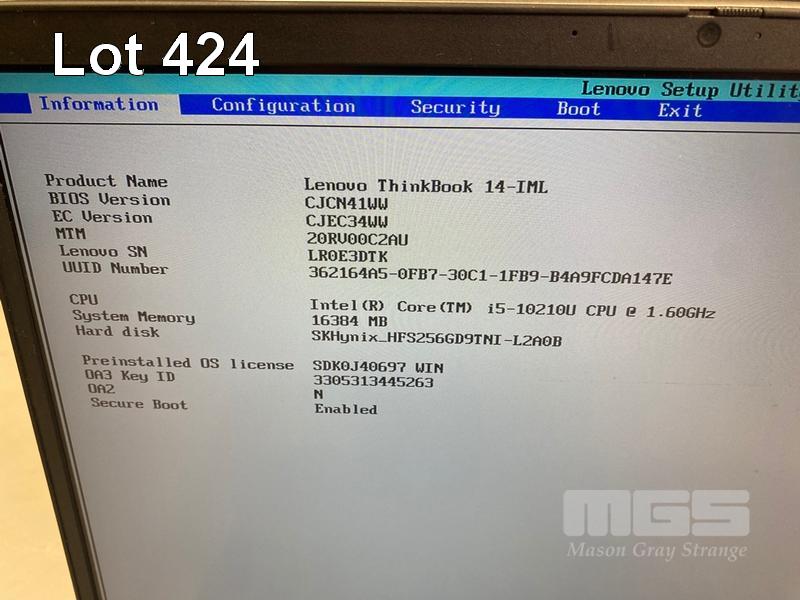 LAPTOP, LENOVO THINKBOOK 14-IML, TYPE 20RV, CORE i5 10210U (10TH GEN) @ 1.6GHz, 16GB DDR4 RAM, 256GB NVMe M.2 SSD, 14" WIDESCREEN (1920x1080), INTEL UHD GRAPHICS, Wi-Fi, BLUETOOTH, WINDOWS 11 PRO INSTALLED & POWER SUPPLY (NOTE: MISSING RUBBER STRIP UNDERNEATH, MARKS ON SCREEN) S/N:LR0E3DTK
