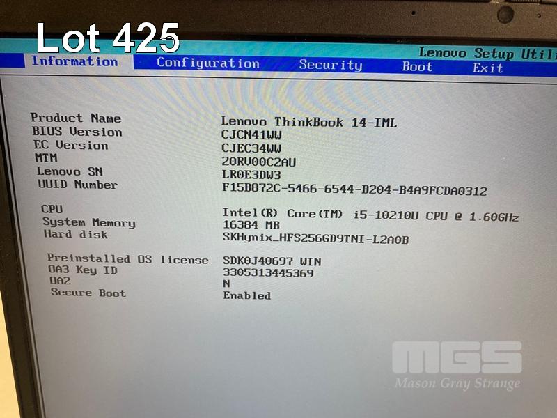 LAPTOP, LENOVO THINKBOOK 14-IML, TYPE 20RV, CORE i5 10210U (10TH GEN) @ 1.6GHz, 16GB DDR4 RAM, 256GB NVMe M.2 SSD, 14" WIDESCREEN (1920x1080), INTEL UHD GRAPHICS, Wi-Fi, BLUETOOTH, WINDOWS 11 PRO INSTALLED & POWER SUPPLY (NOTE: MISSING RUBBER STRIP UNDERNEATH, MINOR MARKS ON SCREEN, MINOR DENT ON CASING) S/N:LR0E3DW3
