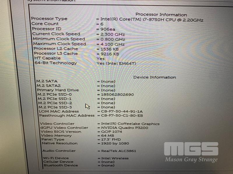 LAPTOP, DELL PRECISION 7730, CORE i7 8750H (8TH GEN) @ 2.2GHz, 64GB DDR4 RAM, 512GB NVMe M.2 SSD, 17.3" WIDESCREEN (1920x1080), 6GB NVIDIA QUADRO P3200 VIDEO, INTEL UHD GRAPHICS 630, Wi-Fi, WINDOWS 11 PRO INSTALLED & POWER SUPPLY (NOTE: NO BATTERY) S/N:GDLDVT2