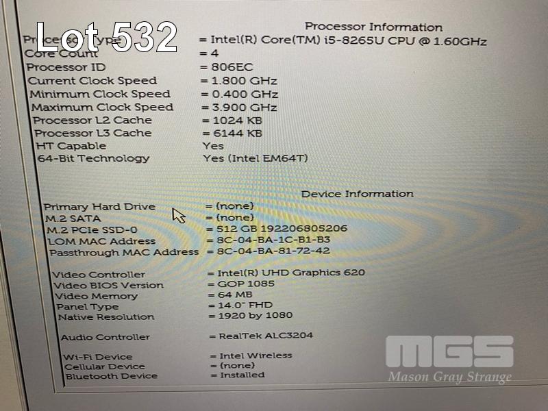 LAPTOP, DELL LATITUDE 5400, CORE i5 8265U (8TH GEN) @ 1.6GHz, 8GB DDR4 RAM, 512GB NVMe M.2 SSD, 14" WIDESCREEN (1920x1080), INTEL UHD GRAPHICS 620, Wi-Fi, BLUETOOTH, WINDOWS 11 HOME INSTALLED & POWER SUPPLY (NOTE: MARKS ON SCREEN) S/N:DSD25Y2