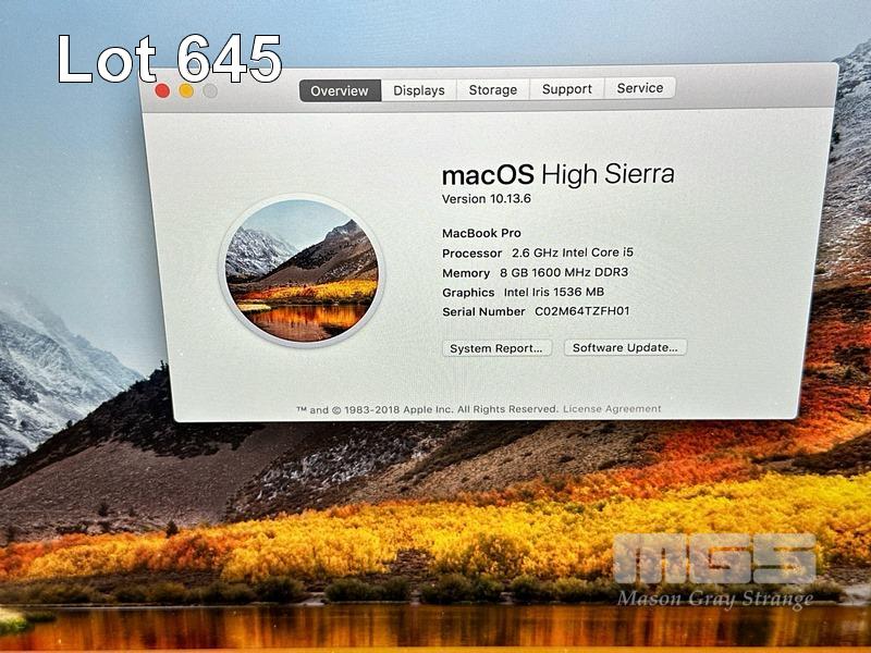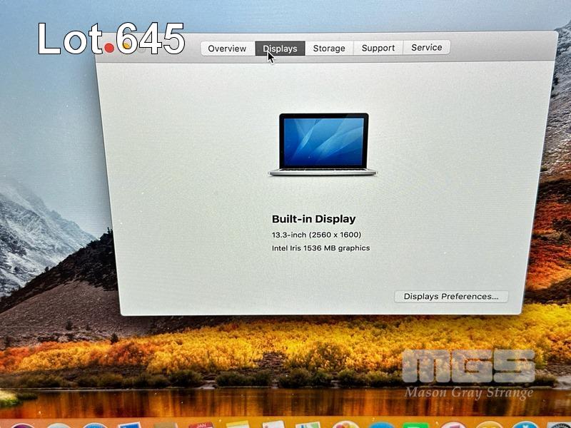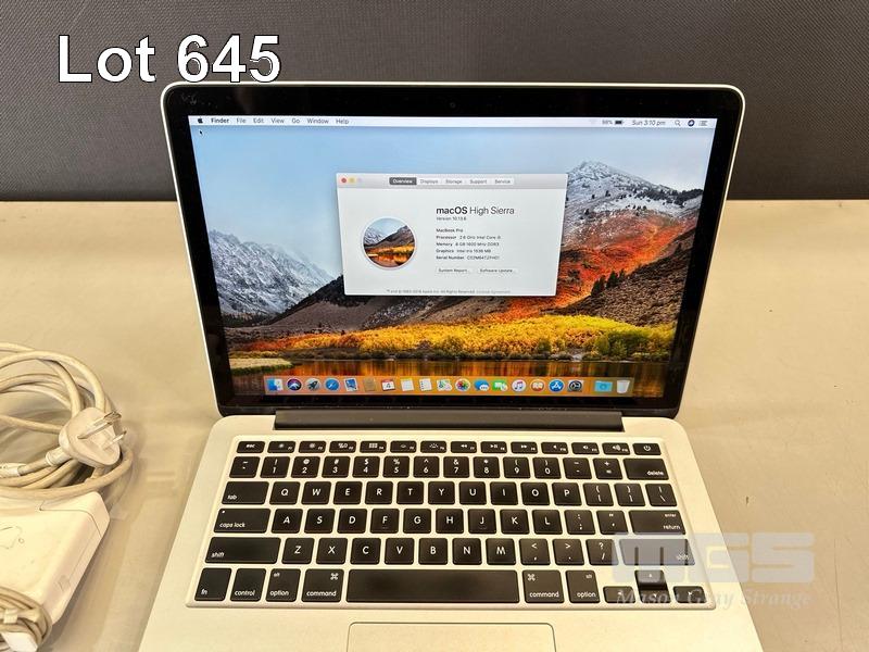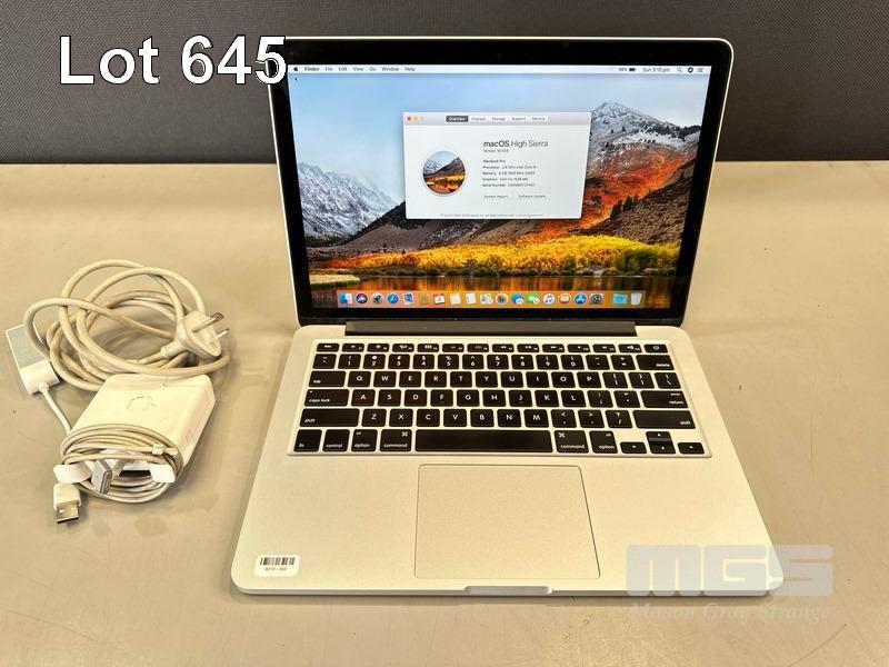LAPTOP, APPLE MACBOOK PRO (A1502), CORE i5 4288U (4TH GEN) @ 2.6GHz, 8GB DDR3 RAM, 512GB SSD, 13.3" DISPLAY (2560x1600), INTEL IRIS GRAPHICS, Wi-Fi, BLUETOOTH, MAC OS 10.13 INSTALLED & POWER SUPPLY (NOTE: MINOR MARKS ON SCREEN) S/N:C02M64TZFH01
