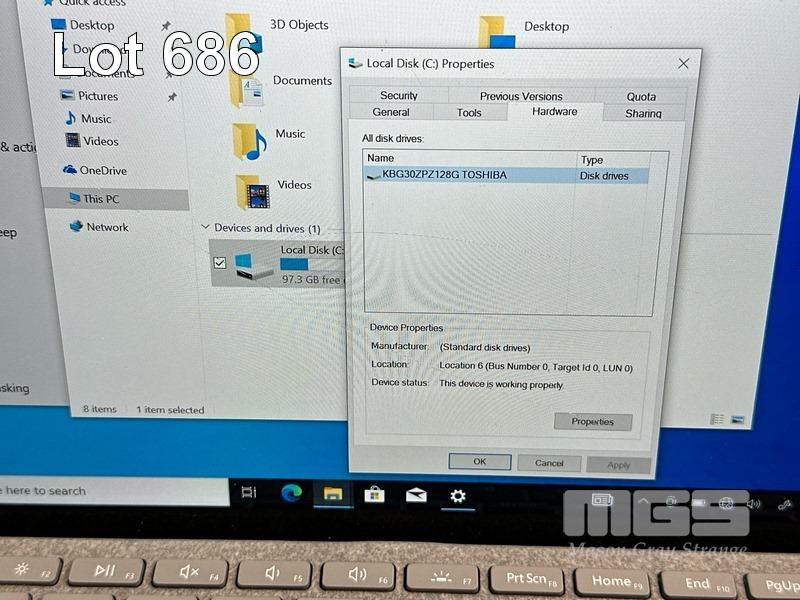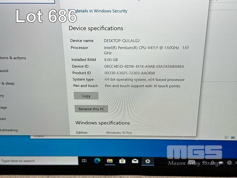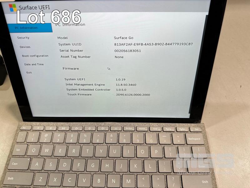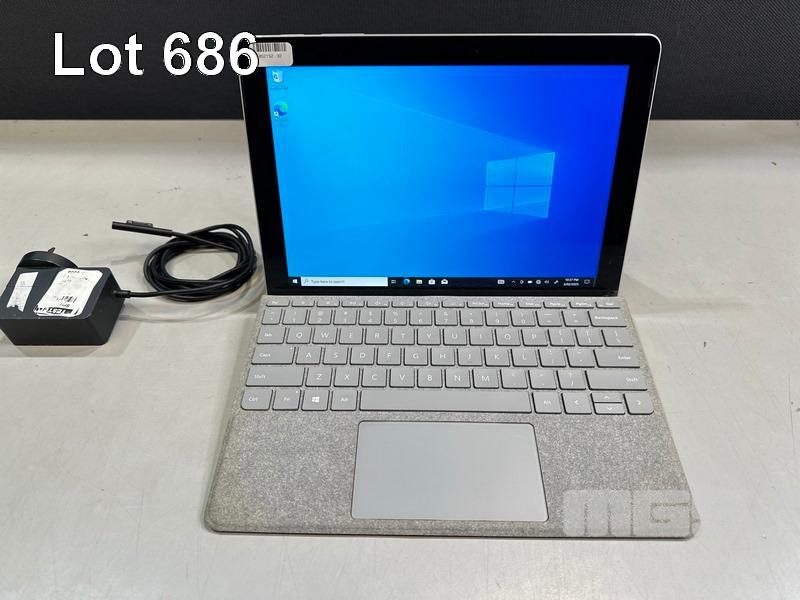 TABLET PC, MICROSOFT SURFACE GO, MODEL 1824, PENTIUM 4415Y @ 1.6GHz, 8GB RAM, 128GB SSD, 10" TOUCHSCREEN (1800x1200), INTEL HD GRAPHICS 615, Wi-Fi, BLUETOOTH, WINDOWS 10 PRO INSTALLED, KEYBOARD TYPE COVER & POWER SUPPLY (NOTE: DAMAGED SCREEN) S/N:002056183051