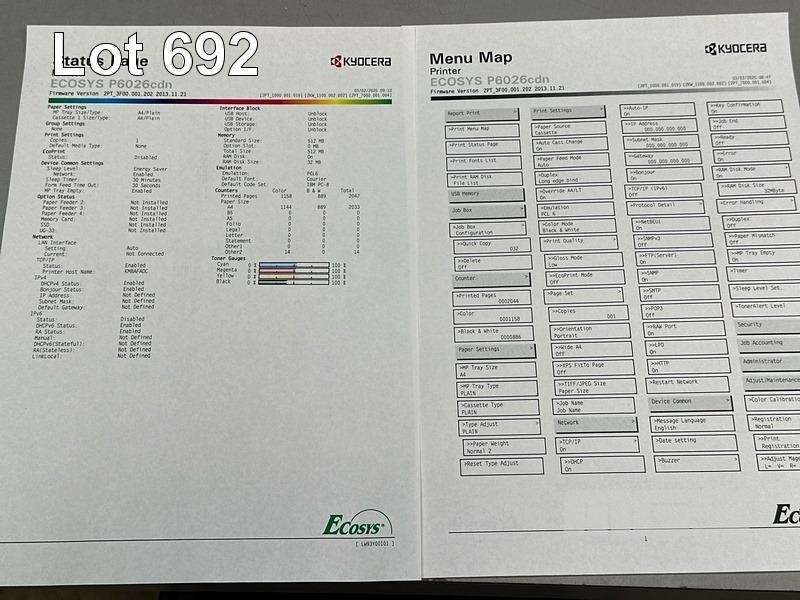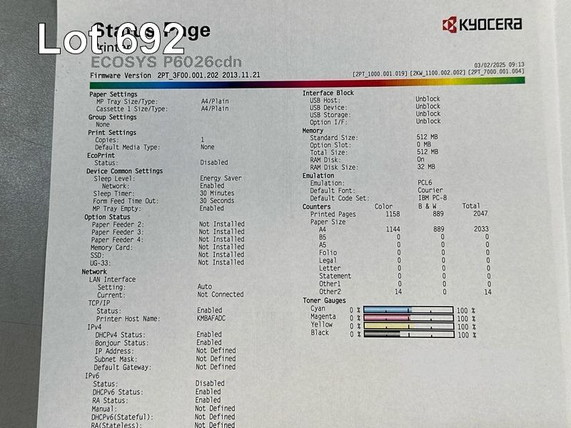 PRINTER, KYOCERA P6026cdn COLOUR LASER, USB, NETWORK, 1,158 COLOUR & 889 B&W PAGES (TEST PAGE ATTACHED) S/N:LW93Y00101