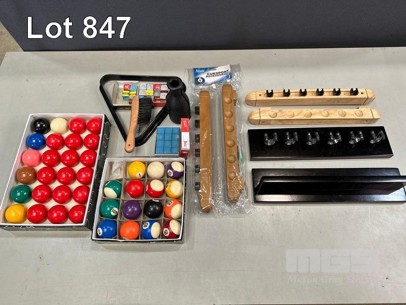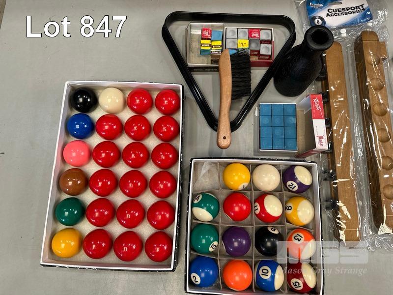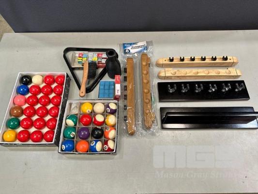QTY ASST POOL ACCESSORIES, SNOOKER BALLS, 8 BALL (MISSING 1 x BALL), CUE RACKS, CHALK, ETC