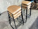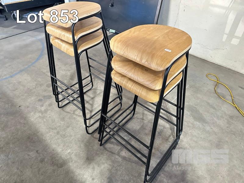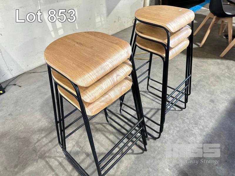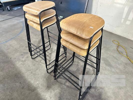 6 x BAR STOOLS, TIMBER TOP, BLACK FRAME