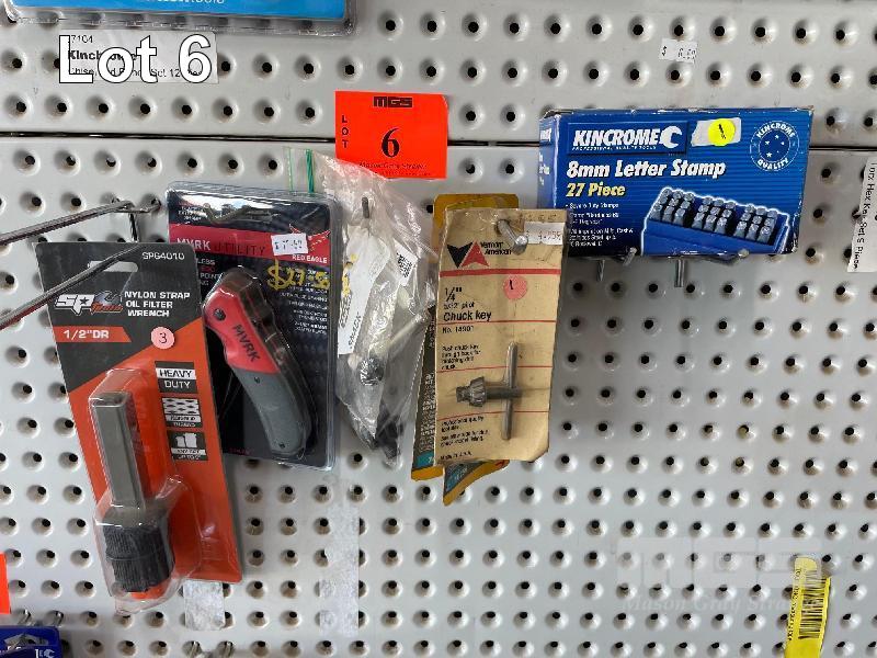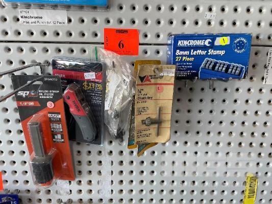 OIL FILTER TOOL, KNIFE, KINCROME NUMBER PUNCH SET & CHUCK KEYS