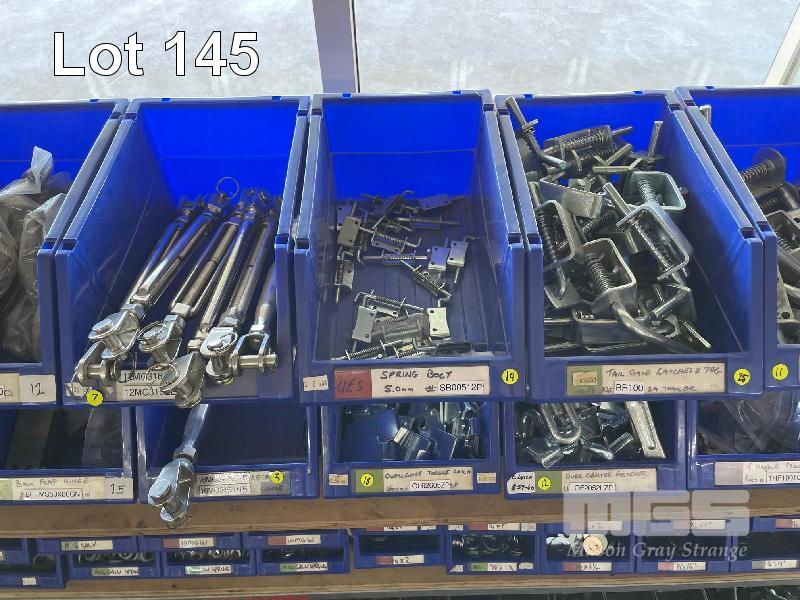 TRAILER SPARES INCLUDING TURNBUCKLES, MAXI PLATES, SPRING BOLT PLATES, DOOR HINGES, LATCHES, STAINLESS STEEL, MILD STEEL, ETC 20 x PVC TUBS