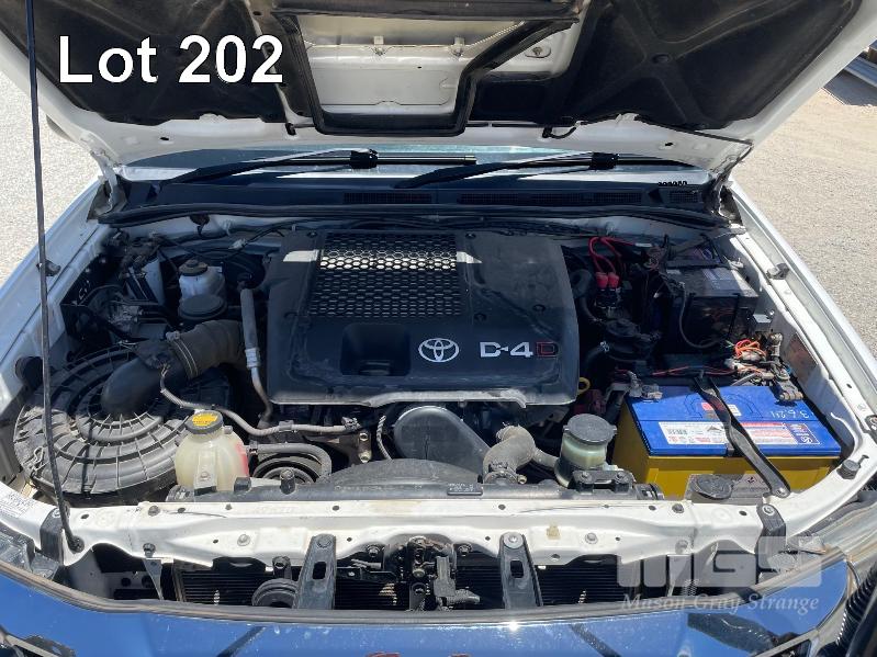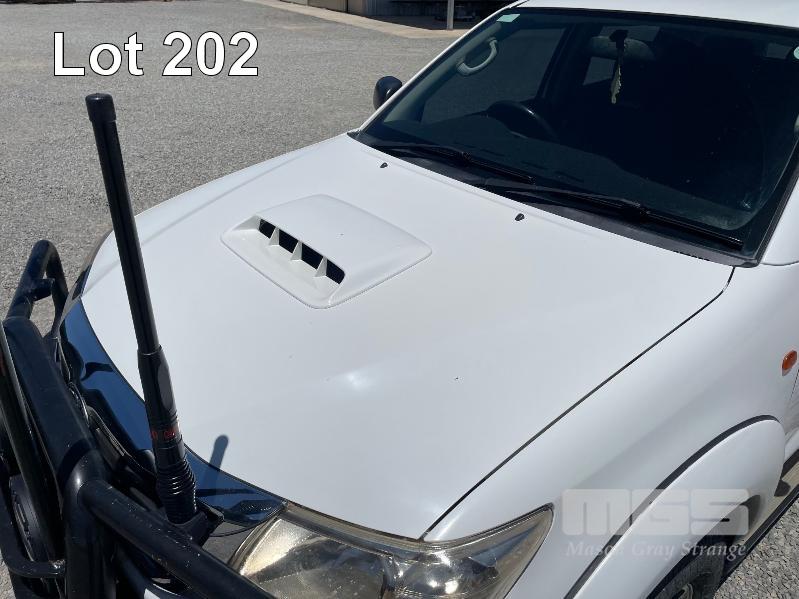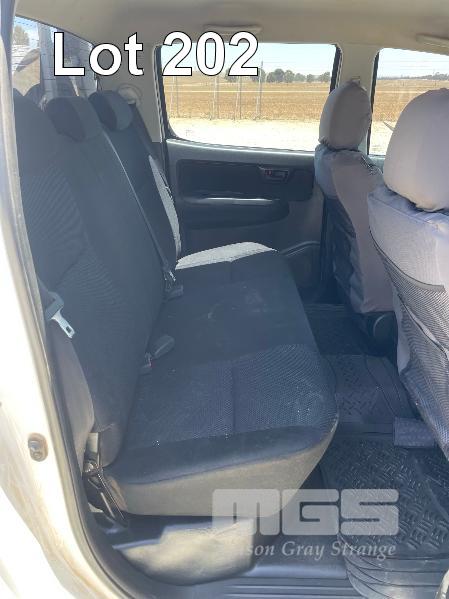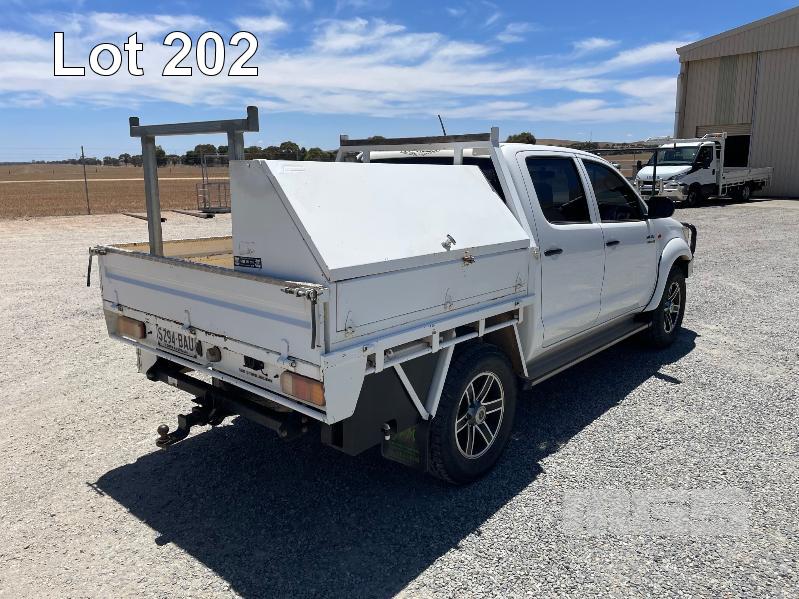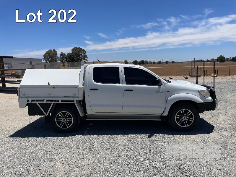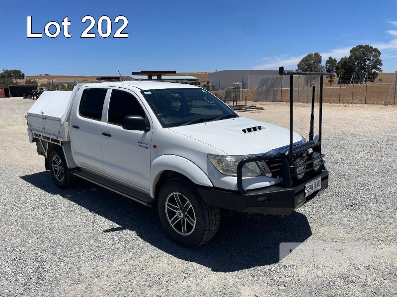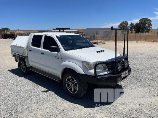 2014 TOYOTA HILUX KUN26RMY12 DUAL CAB UTE 4x4 REG: S294 BAU VIN: MR0FZ22G301083635 ODO: 250,230kms SHOWING 3.0 LITRE DTFI DT4 4 CYLINDER TURBO DIESEL, 5 SPEED MANUAL TRANSMISSION, WHITE DUCO, 4x4 AIR CON, ALLOY WHEELS, BLUETOOTH, SIDE STEP, SPOT LIGHTS, TOW BAR, DUAL BATTERIES CB RADIO STEEL DROP SIDE TRAY 2 x TOOL BOXES WATER STORAGE