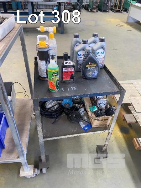 WORKSHOP TROLLEY & CONTENTS, MOBIL EXTRA 24 MOTORBIKE OILS, HAVOLINE 20-50 MULTIGRADE TYRE SEALANT x 2, SIKAGARD, BOAT WASH, BATTERY SWITCH, CASTORS, HOSE CLAMPS, BOAT ROLLER