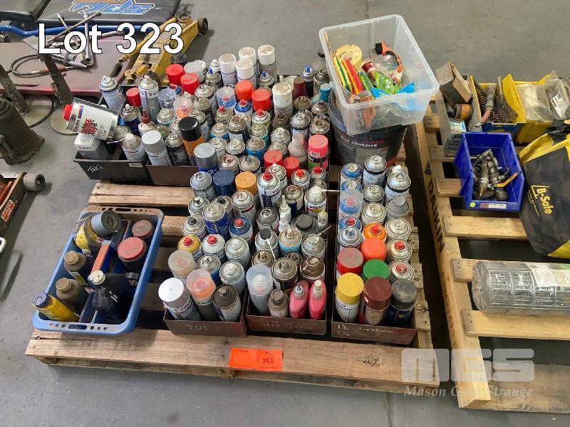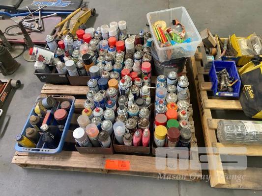 ASSORTED AEROSOL CANS, PAINTS, BRAKE CLEANER, ETC