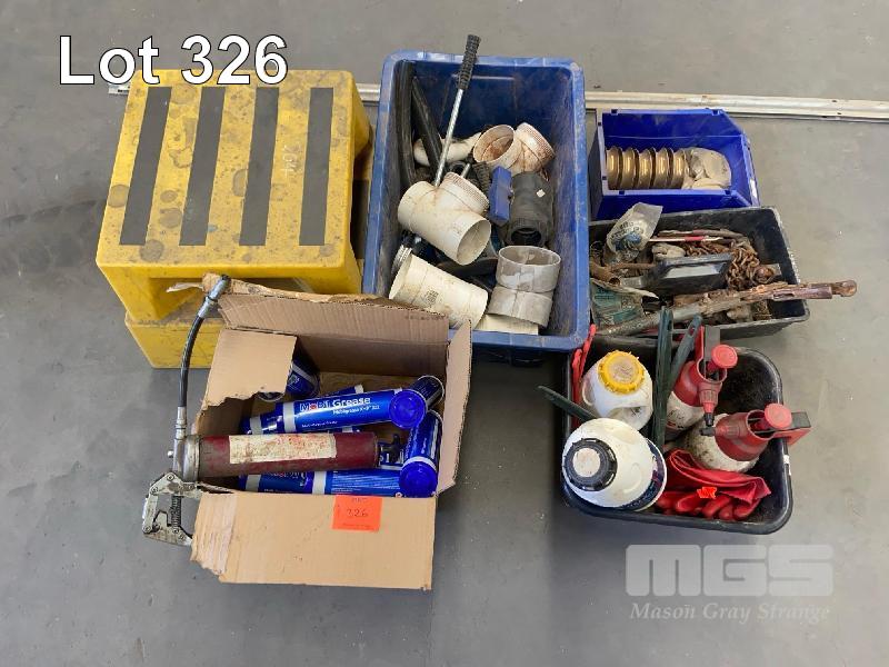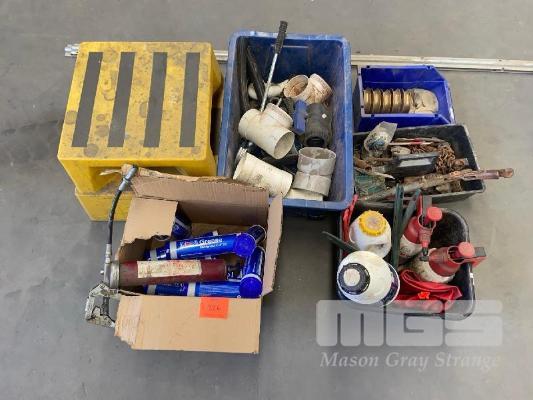 SAFETY STEP, GREASE GUN & 10 x CARTRIDGES MOBIL, ASSORTED PLUMBING FITTINGS, WURTH SPRAY BOTTLES & CLEANING PRODUCTS, JUMPER LEADS & 2 x MECHANICS CREEPERS