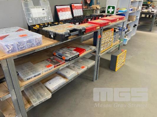 PAIR WORK TABLES, 1500 x 660mm & 1100 x 660mm, STEEL FRAME, PLYWOOD TOP & SHELVES