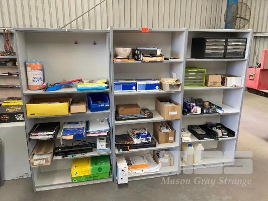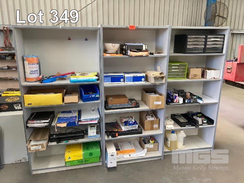 3 x BOOKCASES, GREY LAMINAE & CONTENTS, ASSORTED OFFICE STATIONERY, HARDWARE, BATTERIES, LAMINATOR, ETC